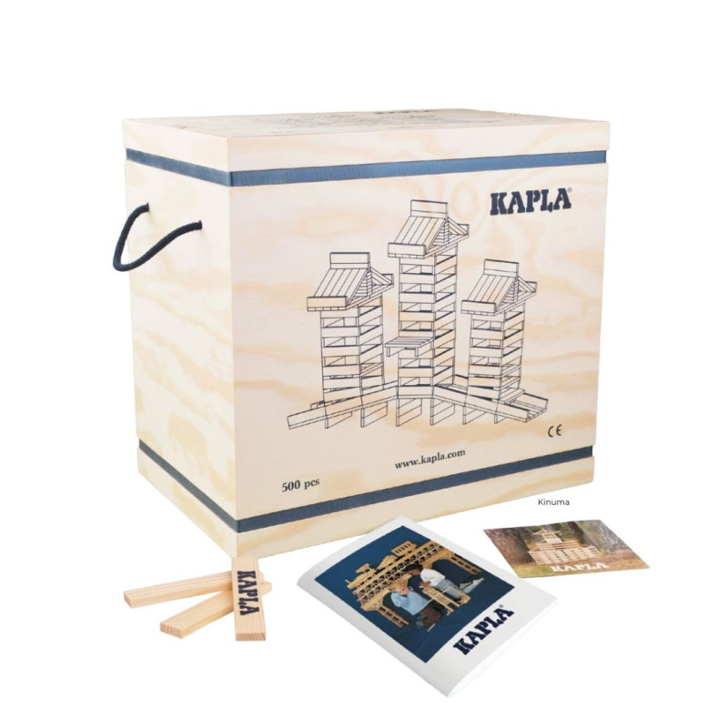 Pack 500 Natural (Kapla): 500 taulons naturals de pi de Landes 100% en una caixa de fusta premium. Inclou 5 taulons amb logotip i fullets amb tècniques i control de qualitat. Ideal per a tallers i projectes col·lectius.
