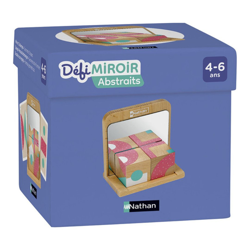 Desafíos con Espejos - Formas geométricas (Nathan): juego manipulativo para comprender el efecto espejo, la simetría axial y trabajar la observación y razonamiento espacial con 24 retos progresivos. Edad 4–6 años.